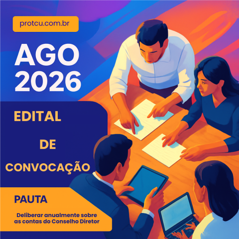 O Conselho Diretor do Pro-TCU convoca seus associados a participarem da Assembleia Geral Ordinária a ser instalada em Brasília-DF, no dia 30 de março de 2026, às 15h, Auditório Ministro Arnaldo Pietro no Anexo III térreo, para deliberar sobre a prestação de contas do Pro-TCU relativas ao exercício de 2025.
